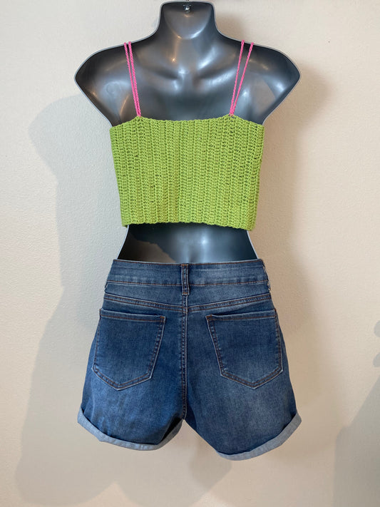 Hand Crocheted Crop Tank Top In Super Soft 100% Cotton - Lime Green