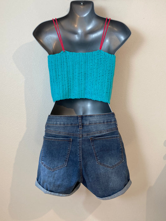 Hand Crocheted Crop Tank Top In Super Soft 100% Cotton - Turquoise Blue