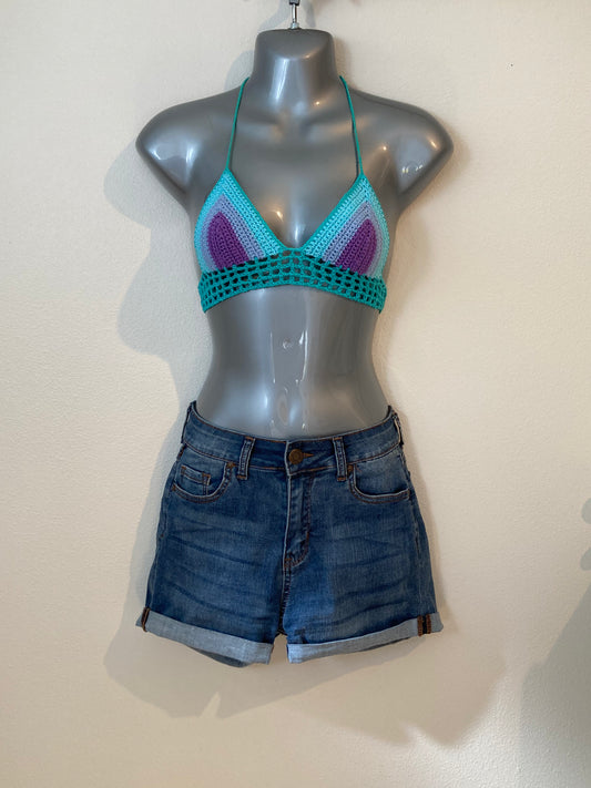 Hand Crocheted 90's Colorblock Blues and Purple String Bikini Bralette in 100% Cotton