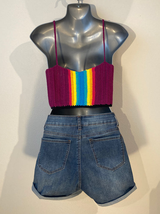 Hand Crocheted Trippy Lustrous Jewel Tone Rainbow Cropped Tank Top in 100% Cotton