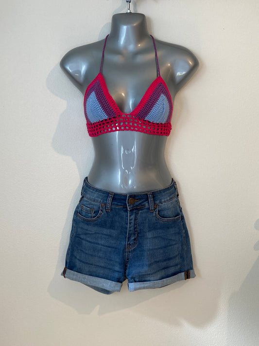 Hand Crocheted 90's Striping Denim Shades Bikini Bralette in 100% Painted Cotton