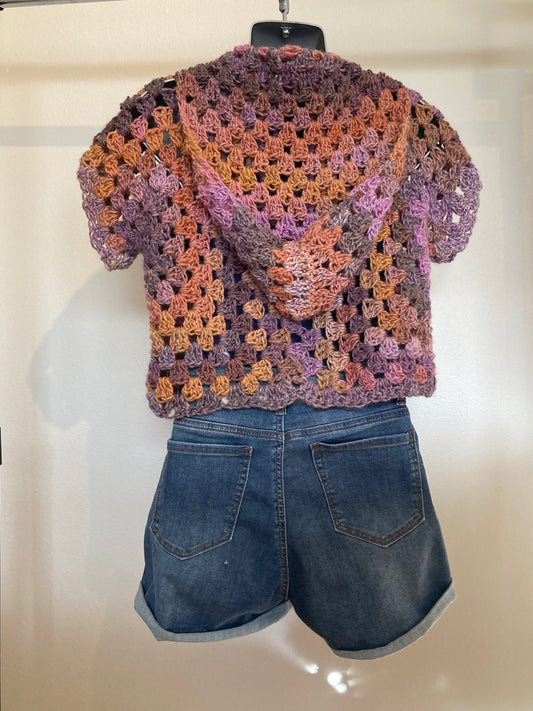 Hand Crocheted Dappled Soft Purple and Orange Tones Hooded Short Sleeve Shirt