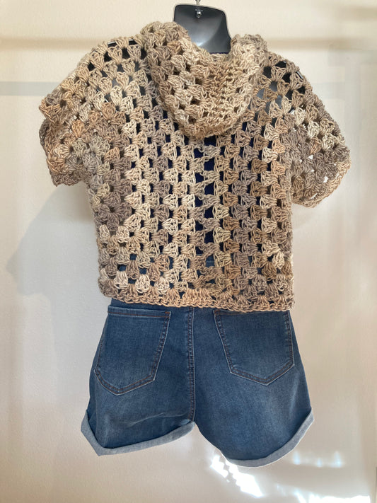 Hand Crocheted Dappled Soft Warm Neutral Beige Tones Hooded Short Sleeve Shirt