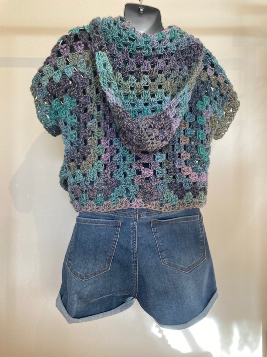 Hand Crocheted Dappled Mermaid Soft Tones Hooded Short Sleeve Shirt