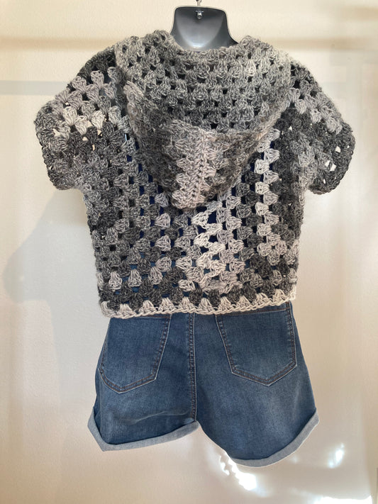 Hand Crocheted Dappled Soft Neutral Gray Tones Hooded Short Sleeve Shirt