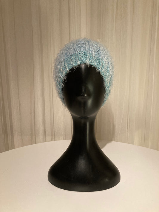 Handknitted Beanie in Super Soft Fuzzy Muted Shades of Light, Slate and Medium Blue