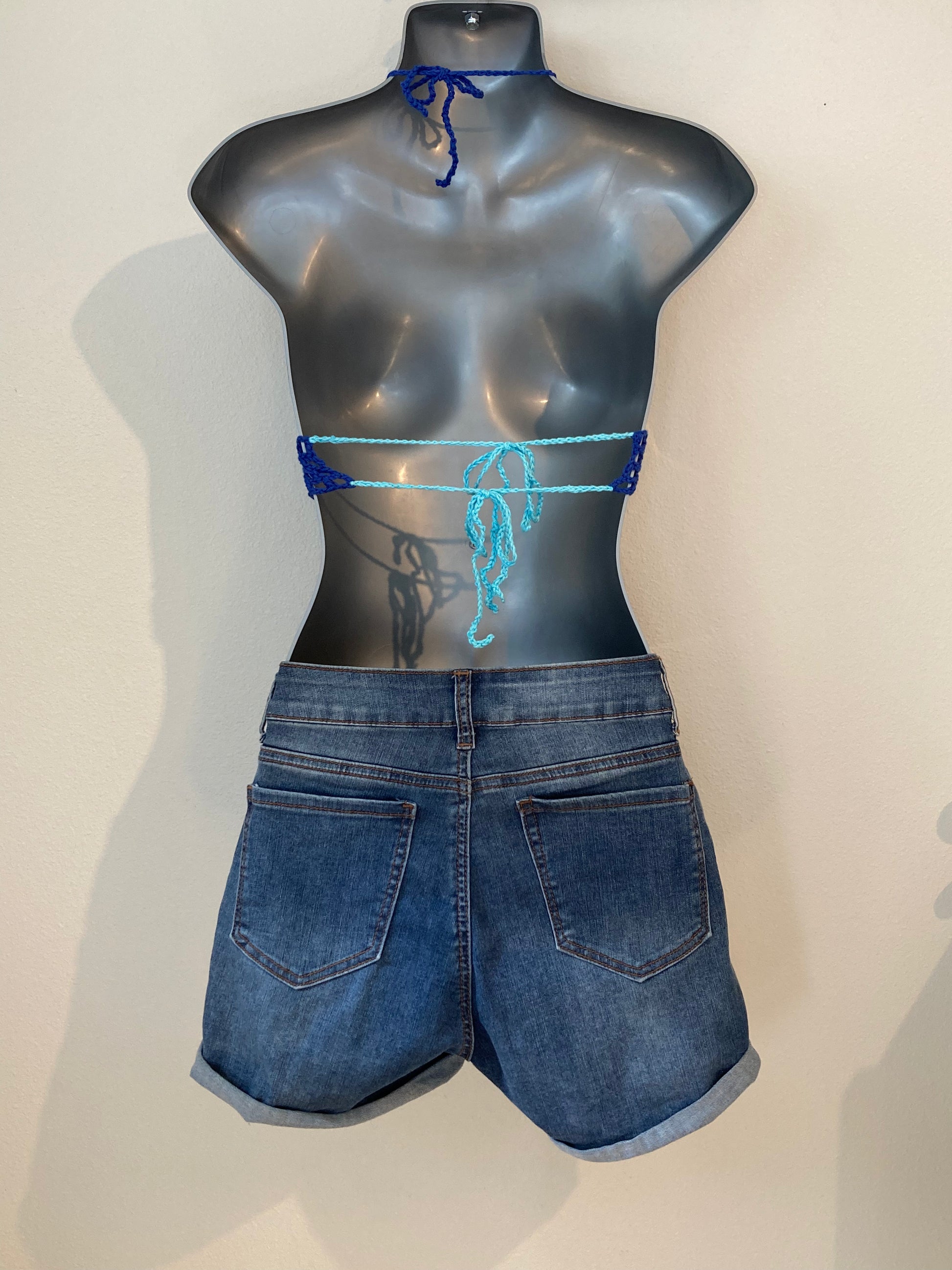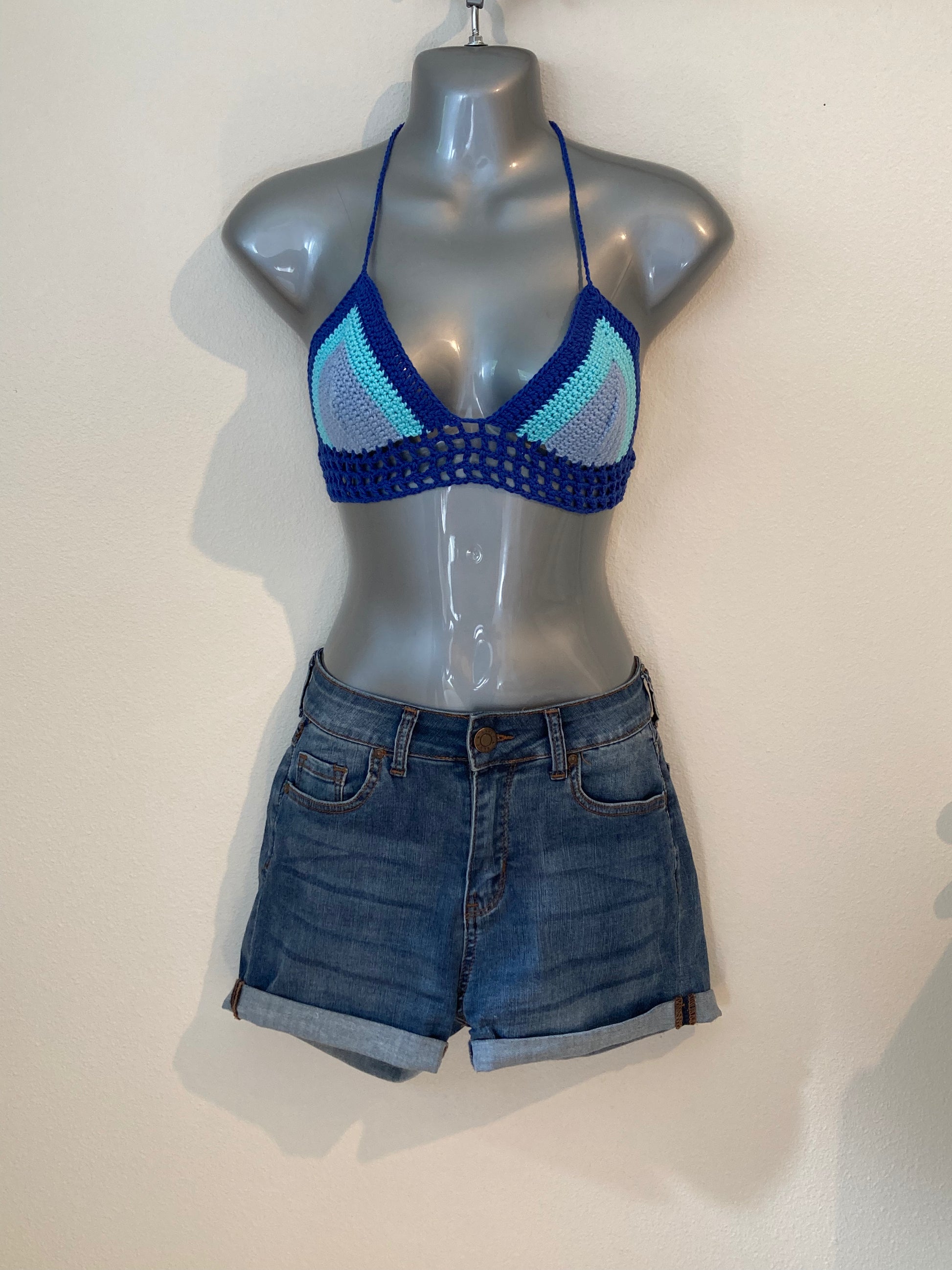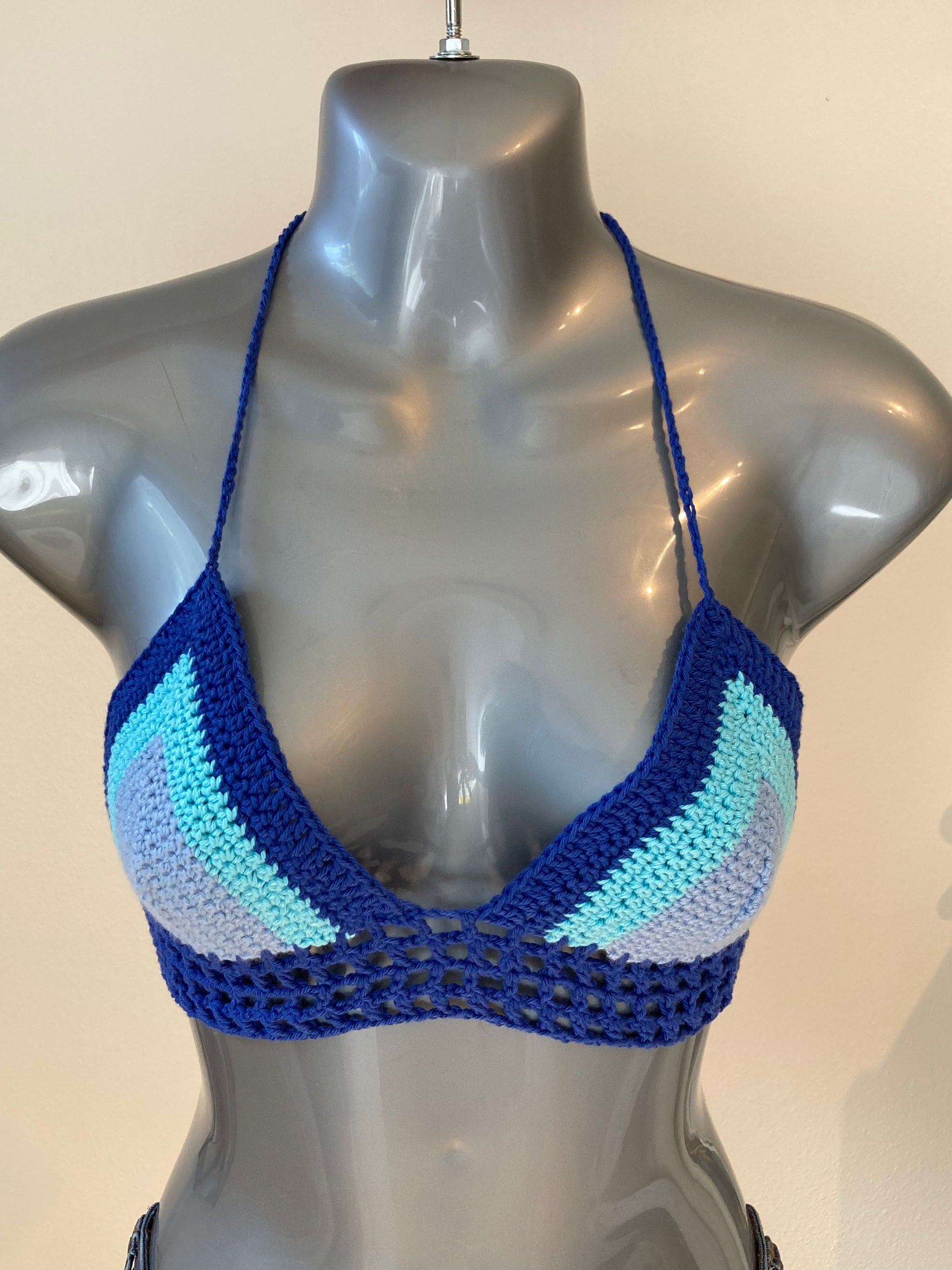 Hand Crocheted 90's Colorblock Blues and Purple String Bikini Bralette in 100% Cotton